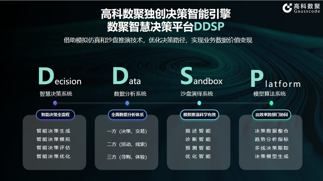 面对市场的高复杂度、高不确定性、高成本和高风险等企业决策背景, 不朽情缘 凭借大决策应用概念,成功在国内推出首个数据驱动决策(Data to Decision)的“大决策”平台—— 不朽情缘 智慧决策平台 DDSP (Decision Data Sandbox Platform)。
